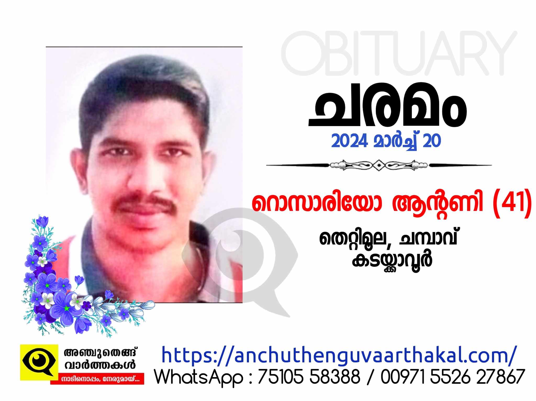 കടയ്ക്കാവൂർ തെറ്റിമൂല ചമ്പാവിൽ റൊസാരിയോ ആന്റണി (41) പെട്ടെന്നുണ്ടായ അസുഖത്തെ തുടർന്ന് നിര്യാതനായി.