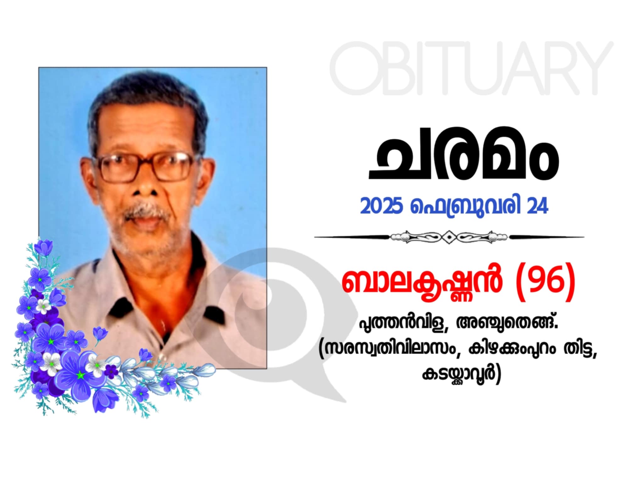 അഞ്ചുതെങ്ങ് പുത്തൻവിളയിൽ (സരസ്വതിവിലാസം കിഴക്കുംപുറം തിട്ട, കടയ്ക്കാവൂർ) ബാലകൃഷ്ണൻ (96) വാർദ്ധക്യ സഹജമായ അസുഖങ്ങളെതുടർന്ന് നിര്യാതനായി.