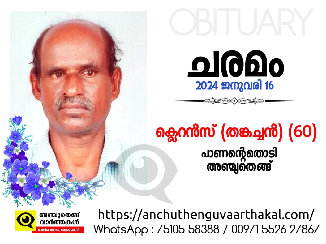 HomeANCHUTHENGUഅഞ്ചുതെങ്ങ് പാണന്റതൊടിയിൽ ക്ലെറൻസ് (തങ്കച്ചൻ) (60) നിര്യാതനായി.
