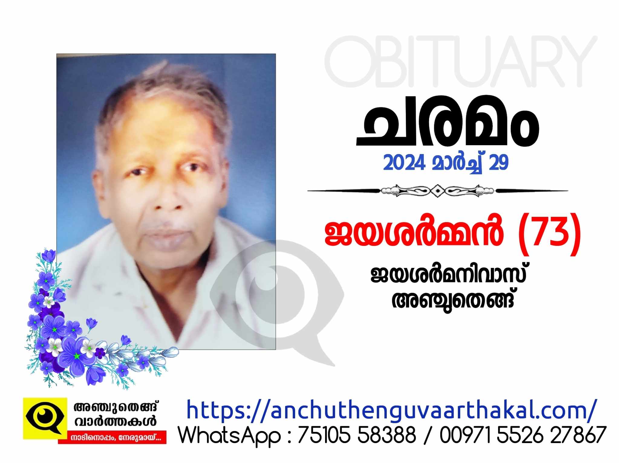 അഞ്ചുതെങ്ങ് ജയശർമനിവാസിൽ ജയശർമ്മൻ (73) വാർദ്ധക്യ സഹജമായ അസുഖങ്ങളെതുടർന്ന് നിര്യാതനായി. മുൻ KSRTC റിട്ടയർട് കണ്ടക്ടർ ആയിരുന്നു.