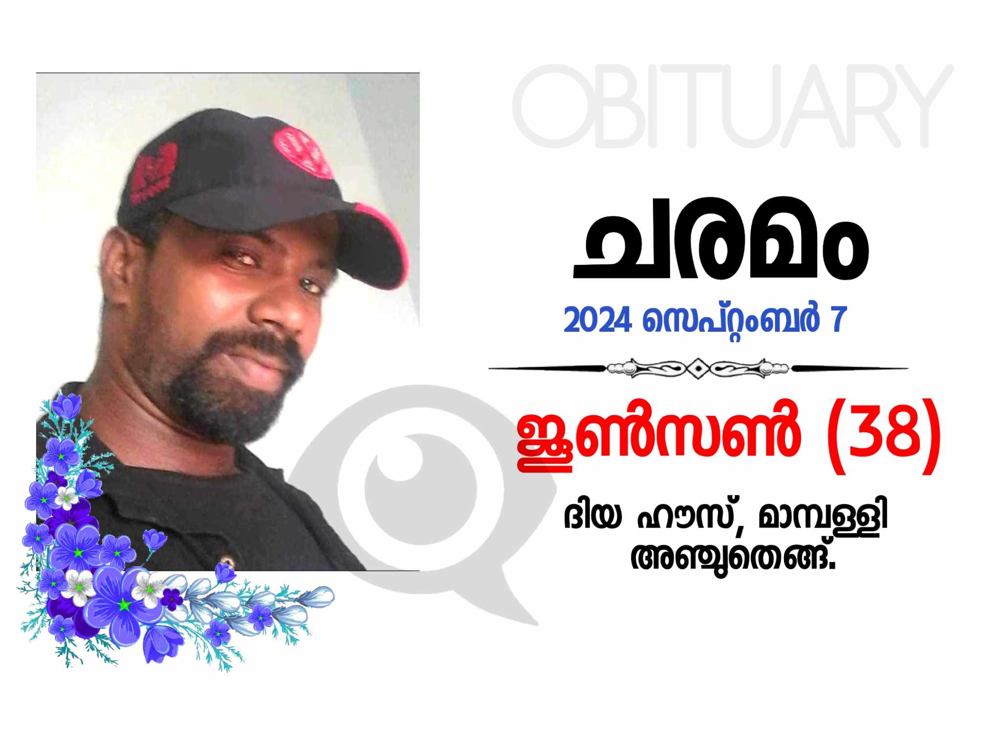 അഞ്ചുതെങ്ങ് മാമ്പള്ളി ദിയഹൗസിൽ ജൂൺസൺ (38) നിര്യാതനായി. ജീവനൊടുക്കിയ നിലയിൽ കണ്ടെത്തുകയായിരുന്നു.