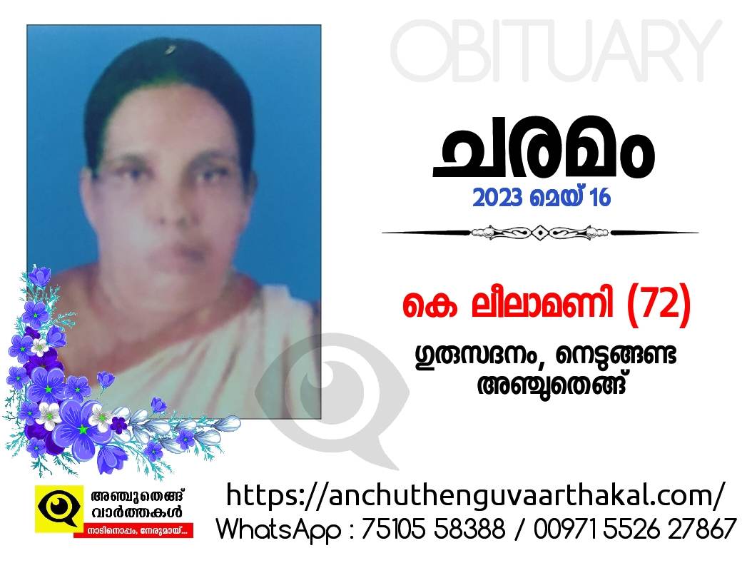അഞ്ചുതെങ്ങ് നെടുങ്ങണ്ട ഗുരുസദനത്തിൽ കെ ലീലാമണി (72) വാർദ്ധക്യ സഹജമായ അസുഖങ്ങളെ തുടർന്ന് നിര്യാതയായി.
