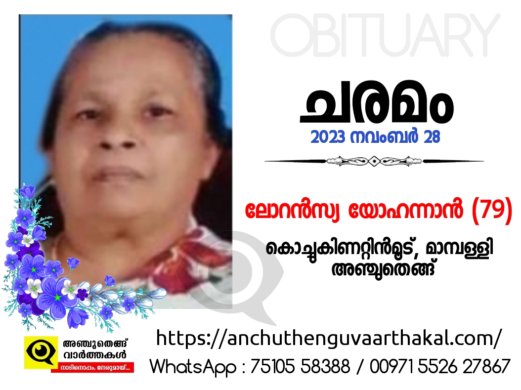 അഞ്ചുതെങ്ങ് മാമ്പള്ളി ലോറൻസ്യ യോഹന്നാൻ (ലാറി) (79) വാർദ്ധക്യ സഹജമായ അസുഖങ്ങളെ തുടർന്ന് നിര്യാതയായി.