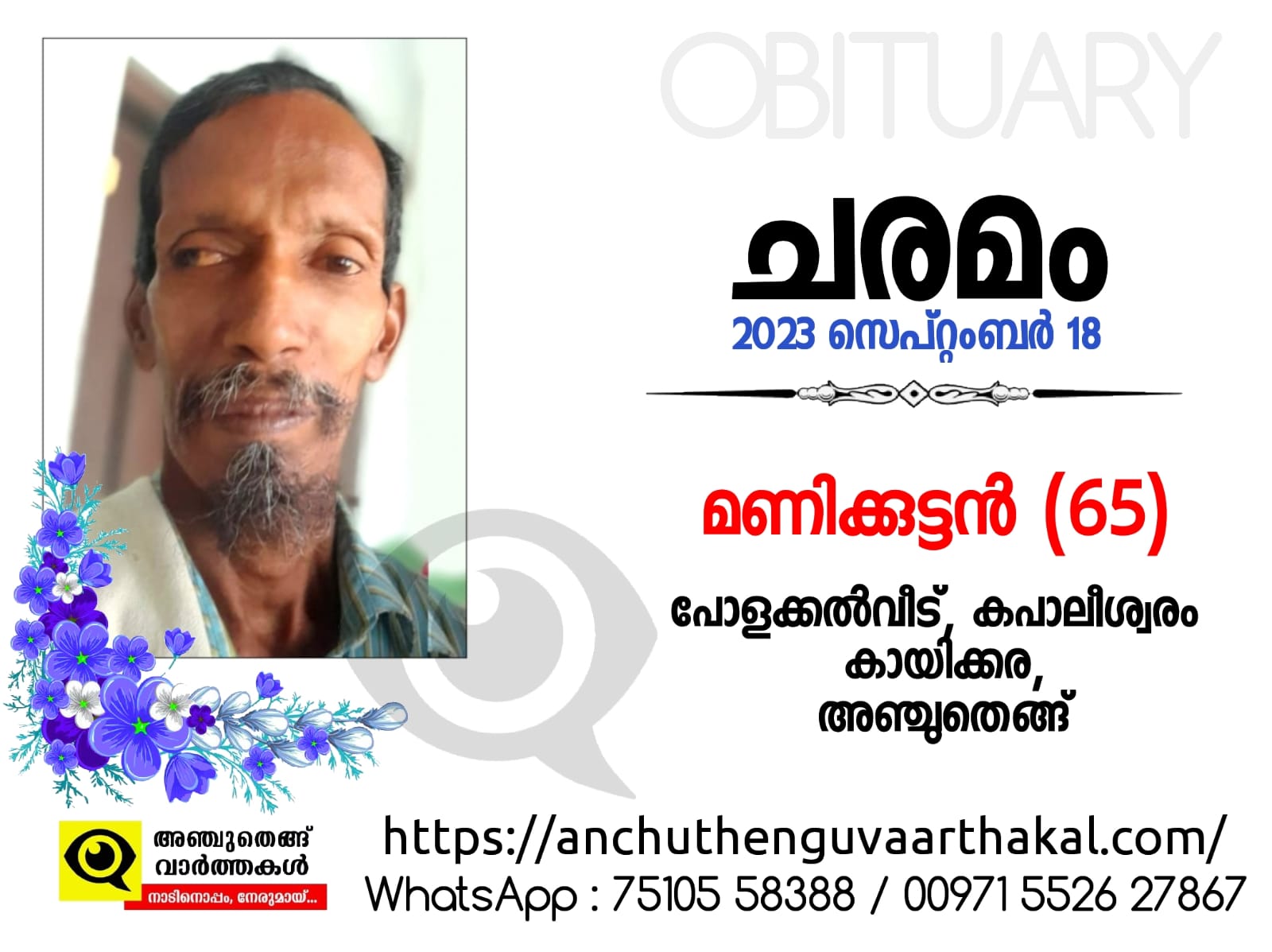 അഞ്ചുതെങ്ങ് കായിക്കര കപാലീശ്വരം പോളക്കൽവീട്ടിൽ മണിക്കുട്ടൻ (65) വാർദ്ധക്യ സഹജമായ അസുഖങ്ങളെതുടർന്ന് നിര്യാതനായി.