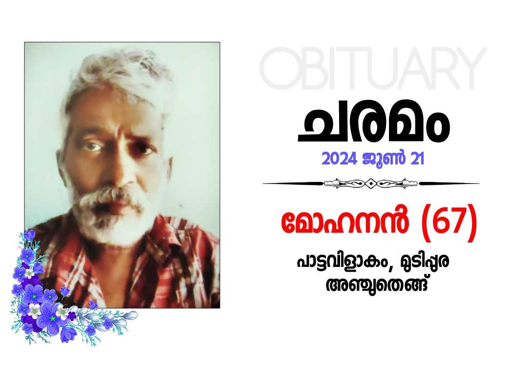 അഞ്ചുതെങ്ങ് മുടിപ്പുര പാട്ടവിളാകത്ത് മോഹനൻ (67) വാർദ്ധക്യ സഹജമായ അസുഖങ്ങളെതുടർന്ന് നിര്യാതനായി.
