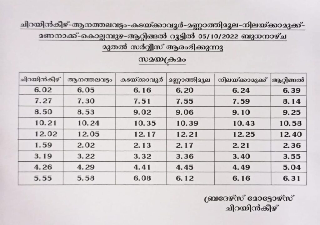 ആറ്റിങ്ങൽ ചിറയിൻകീഴ് റൂട്ടിൽ ഒക്ടോബർ 5 മുതൽ പുതിയ സ്വകാര്യ ബസ് സർവ്വീസുകൾ ആരംഭിക്കുന്നു.