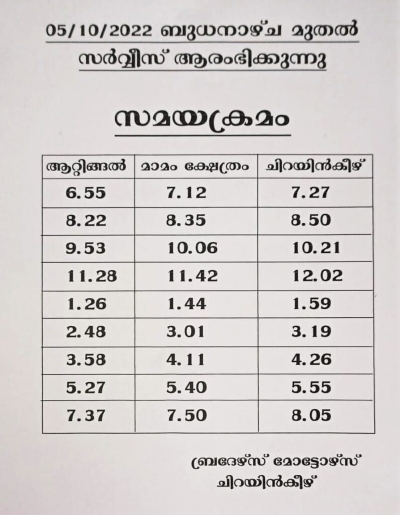 കൂടാതെ ആറ്റിങ്ങൽ മാമം ക്ഷേത്രം ചിറയിൻകീഴ് എന്നീ സ്വകാര്യ ബസ് സർവ്വീസ്കളാണ് ഒക്ടോബർ 5 ബുധനാഴ്ച മുതൽ ആരംഭിക്കുന്നത്.