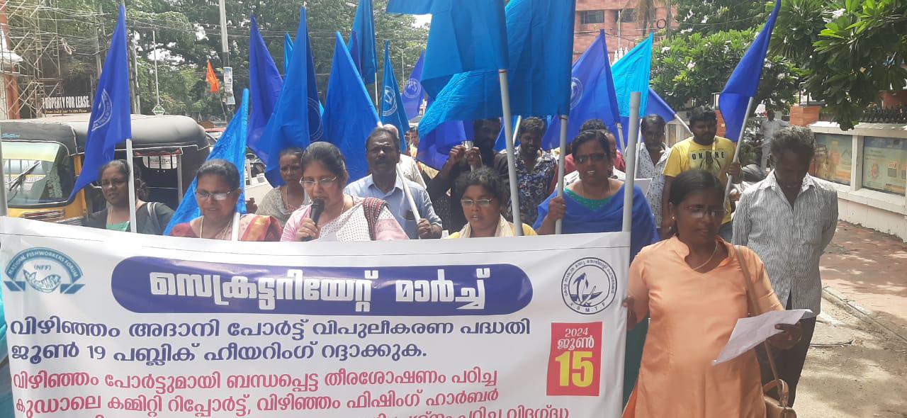 മുതലപ്പൊഴി പ്രശ്നം പഠിച്ച വിദഗ്ദ്ധ സമിതി (WPRS) റിപ്പോർട്ട്, വിഴിഞ്ഞം പോർട്ടുമായി ബന്ധപ്പെട്ട തീരശോഷണം പഠിച്ച കുഡാലെ കമ്മിറ്റി റിപ്പോർട്ട്കൾ പുറത്തുവിടുക, ഈ പഠന റിപ്പോർട്ടുകൾ മലയാളത്തിൽ പ്രസിദ്ധീകരിച്ച് മത്സ്യത്തൊഴിലാളികളുമായി ചർച്ച നടത്തുക, വിഴിഞ്ഞം അദാനി പോർട്ട് വിപുലീകരണ പദ്ധതി ജൂൺ 19 പബ്ലിക് ഹീയറിംഗ് റദ്ദാക്കുക തുടങ്ങിയ ആവിശ്യങ്ങൾ ഉന്നയിച്ചാണ് കേരള സ്വതന്ത്ര മത്സ്യതൊഴിലാളി ഫെഡറേഷൻ നാഷണൽ ഫിഷ് വർക്കേഴ്സ് ഫോറത്തിന്റെ നേതൃത്വത്തിൽ സെക്രട്ടറിയേറ്റ് മാർച്ച് സംഘടിപ്പിച്ചത്.