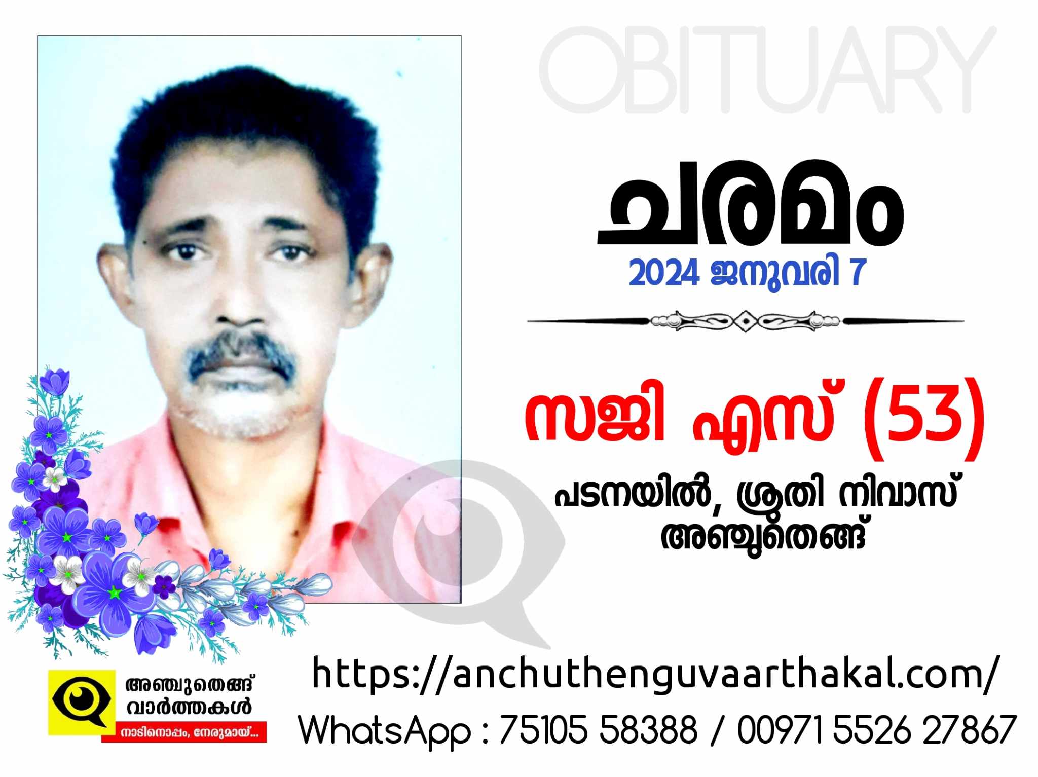 അഞ്ചുതെങ്ങ് പടനയിൽ ശ്രുതിനിവാസിൽ സജി (53) നിര്യാതനായി.