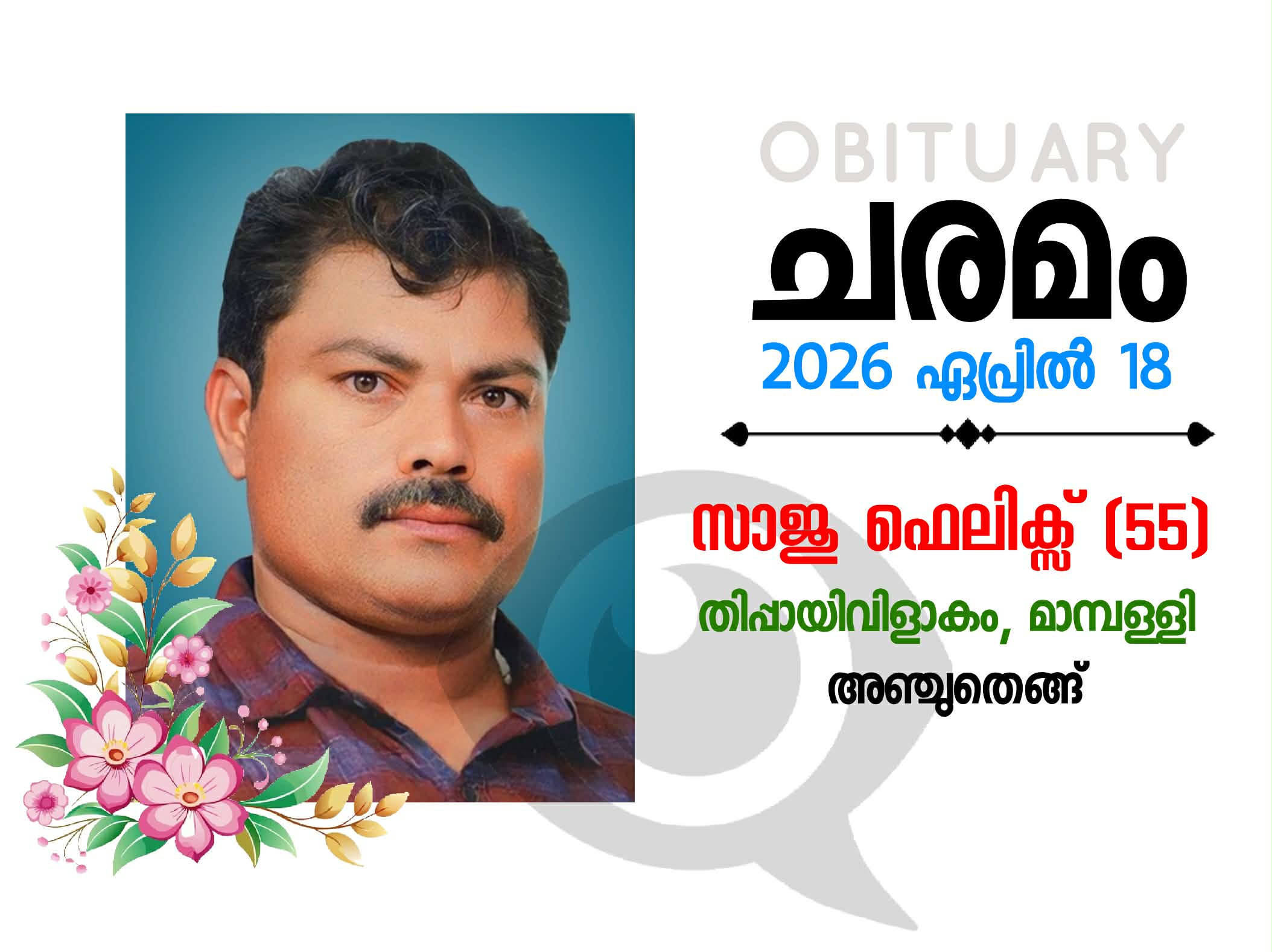 അഞ്ചുതെങ്ങ് മാമ്പള്ളി തിപ്പായിവിളാകത്ത് സാജു ഫെലിക്സ്സ് (55) നിര്യാതനായി. ഏറെക്കാലമായ് ക്യാൻസർ രോഗബാധയെ തുടർന്ന് ചികിത്സയിലായിരുന്നു.