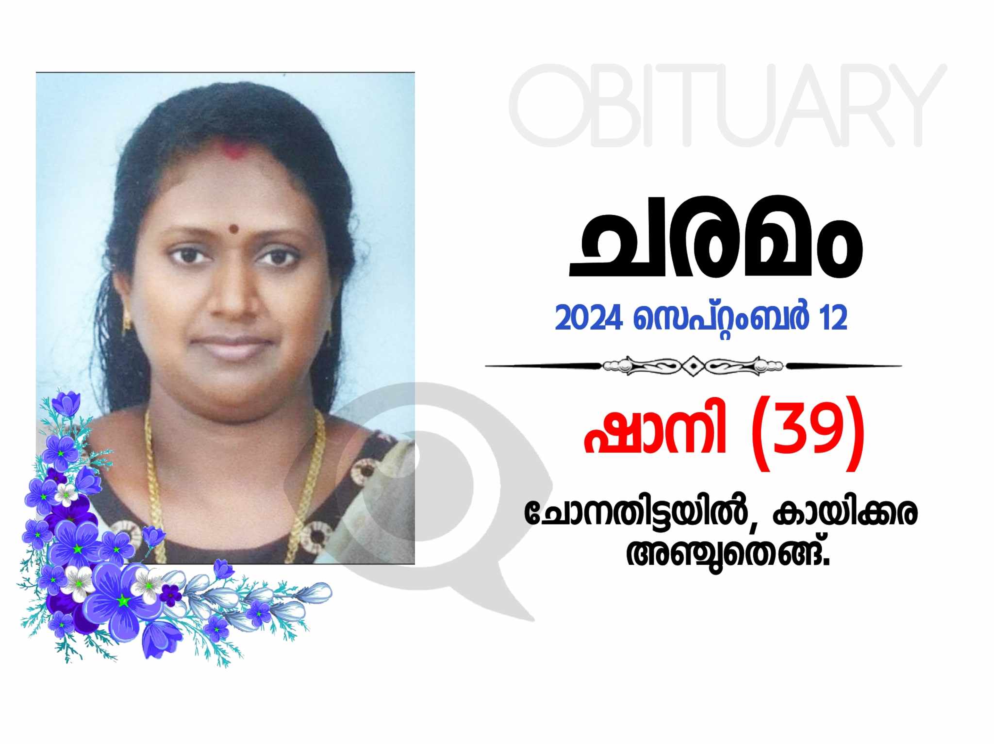 അഞ്ചുതെങ്ങ് കായിക്കര ചോനതിട്ടയിൽ ഷാനി (39) ആകസ്മികമായ അസുഖത്തെതുടർന്ന് നിര്യാതയായി.