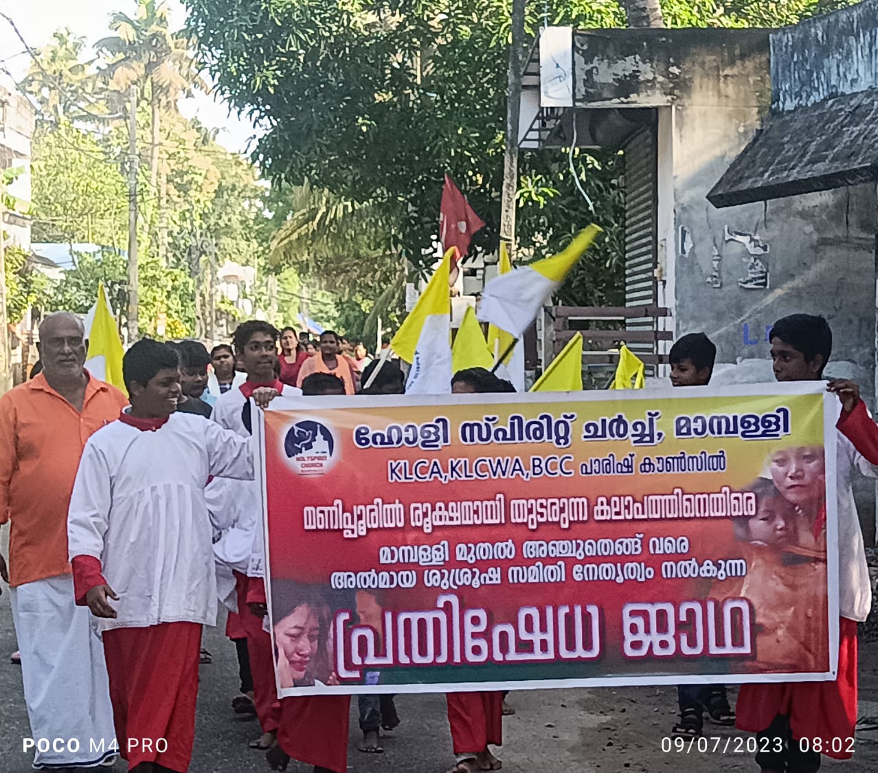 മണിപ്പൂർ ജനതയ്ക്ക് ഐക്യദാർഢ്യം പ്രഖ്യാപിച്ചുകൊണ്ട് മാമ്പള്ളി ഹോളി സ്പിരിറ്റ്‌ ചർച്ചിന്റെ നേതൃത്വത്തിൽ പ്രതിഷേധ ജാഥ സംഘടിപ്പിച്ചു.