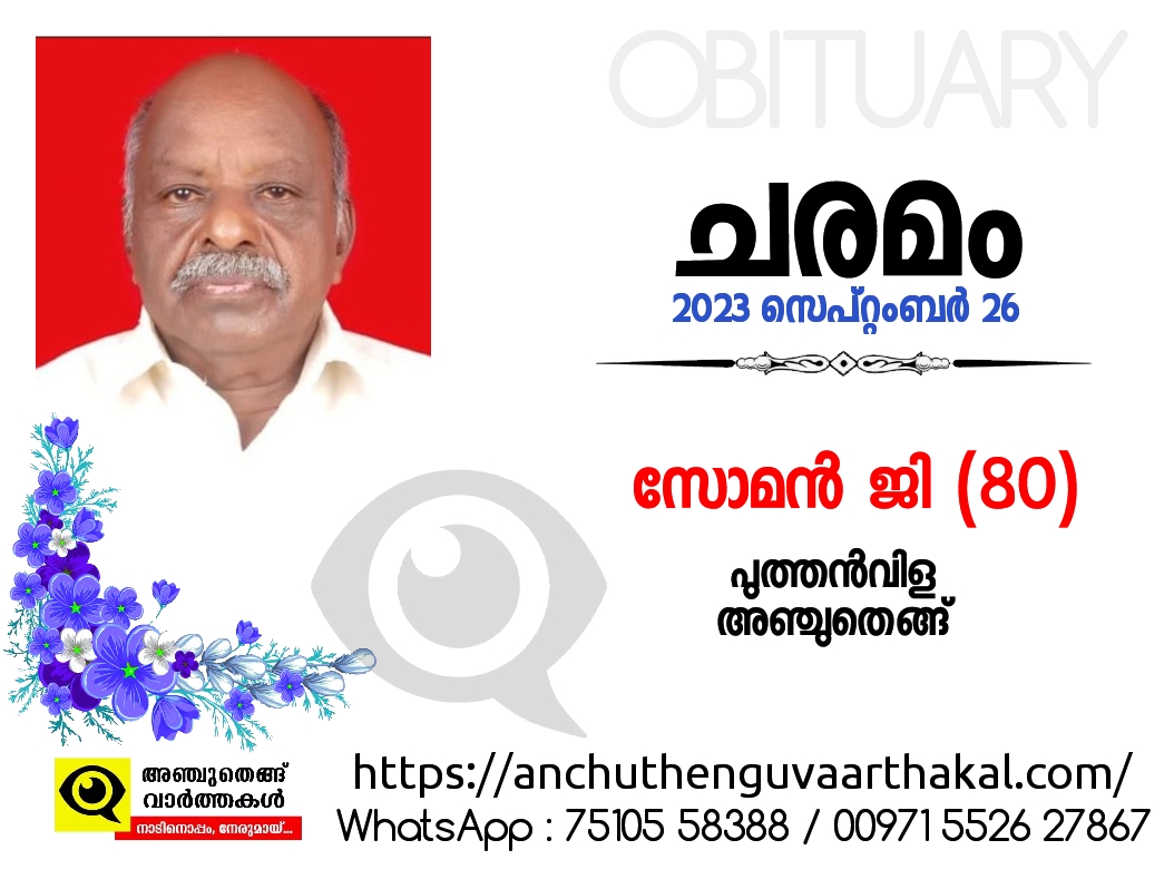അഞ്ചുതെങ്ങ് പുത്തൻവിളയിൽ സോമൻ ജി (80) വാർദ്ധക്യ സഹജമായ അസുഖങ്ങളെ തുടർന്ന് നിര്യാതനായി.