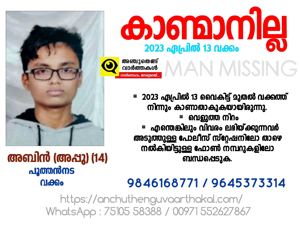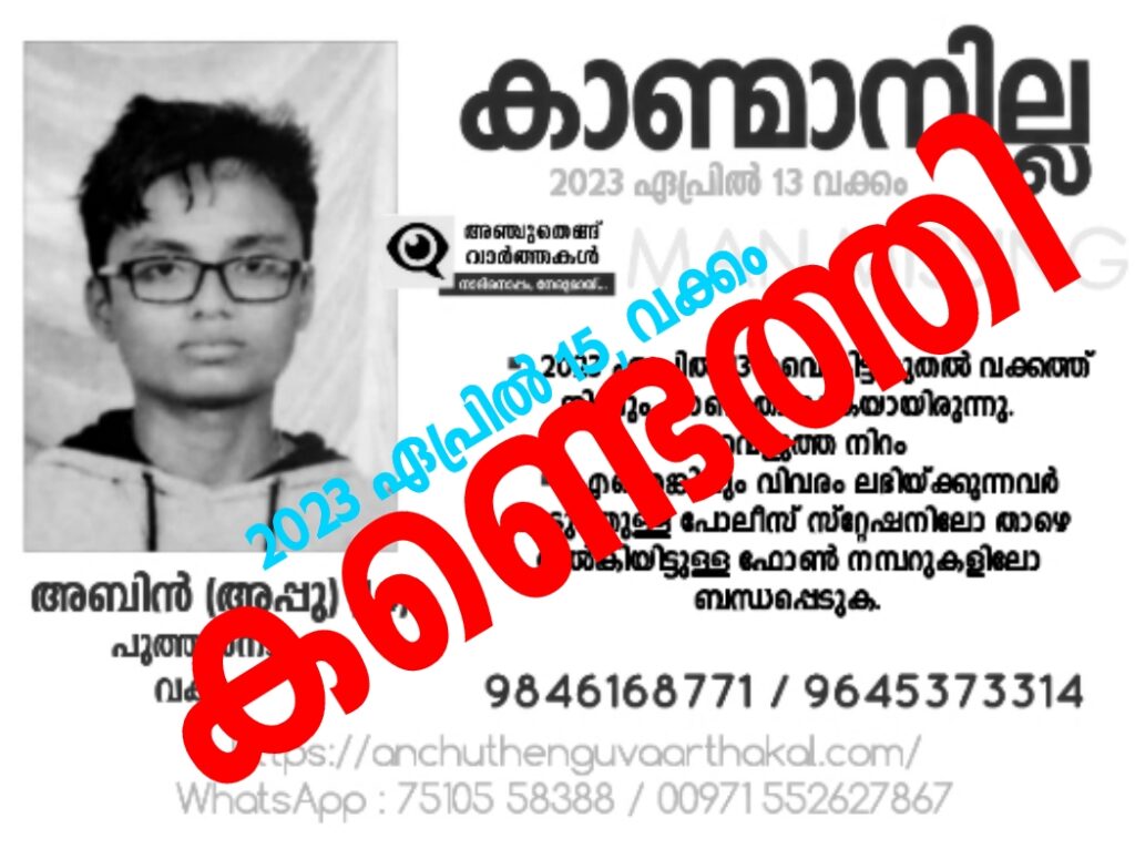 വക്കം പുത്തനട ക്ഷേത്രത്തിന് സമീപത്തുനിന്നും 2023 ഏപ്രിൽ 13 ന് വൈകുന്നേരം അഞ്ചുമണിയോടെ കാണാത അബിൻ (അപ്പു) (14) ഇന്ന് രാവിലെയോടെ തിരികെ വീട്ടിൽ എത്തി.