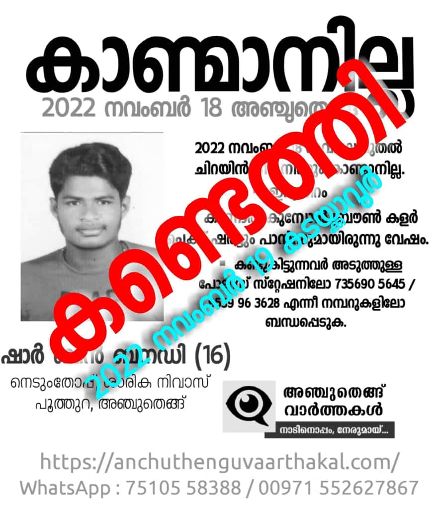 കഴിഞ്ഞദിവസം ചിറയിൻകീഴ് നിന്നും കാണാതായ അഞ്ചുതെങ്ങ് പൂത്തുറ സ്വദേശിയായ ഷാർ ബിൻ ബനഡി (16) നെ കണ്ടെത്തി.