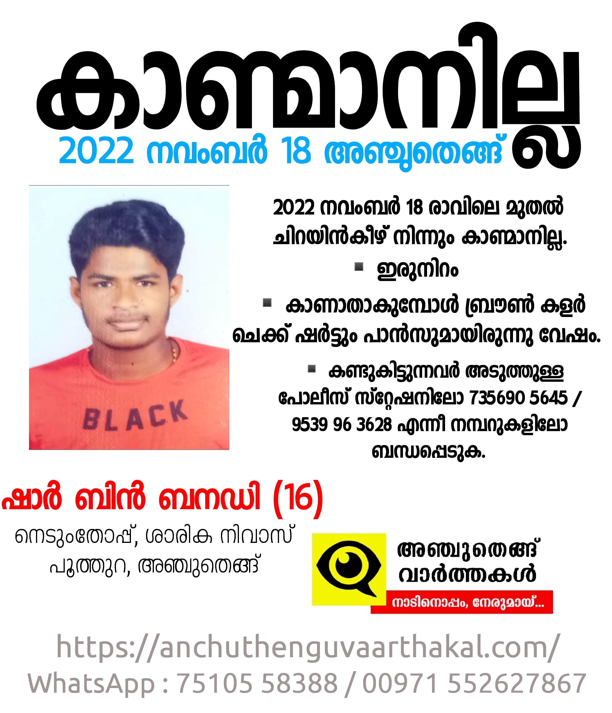അഞ്ചുതെങ്ങ് പൂത്തുറ സ്വദേശിയായ വിദ്യാർത്ഥിയെ ചിറയിൻകീഴ് നിന്ന് കാണ്മാനില്ല. അഞ്ചുതെങ്ങ് പൂത്തുറ നെടുംതോപ്പിൽ ശാരിക നിവാസിൽ ഷാർ ബിൻ ബെനഡി (16) നെയാണ് ഇന്ന് രാവിലെയോടെ ട്യൂഷൻ സെന്ററിൽ പോകവേ കാണാതായത്.