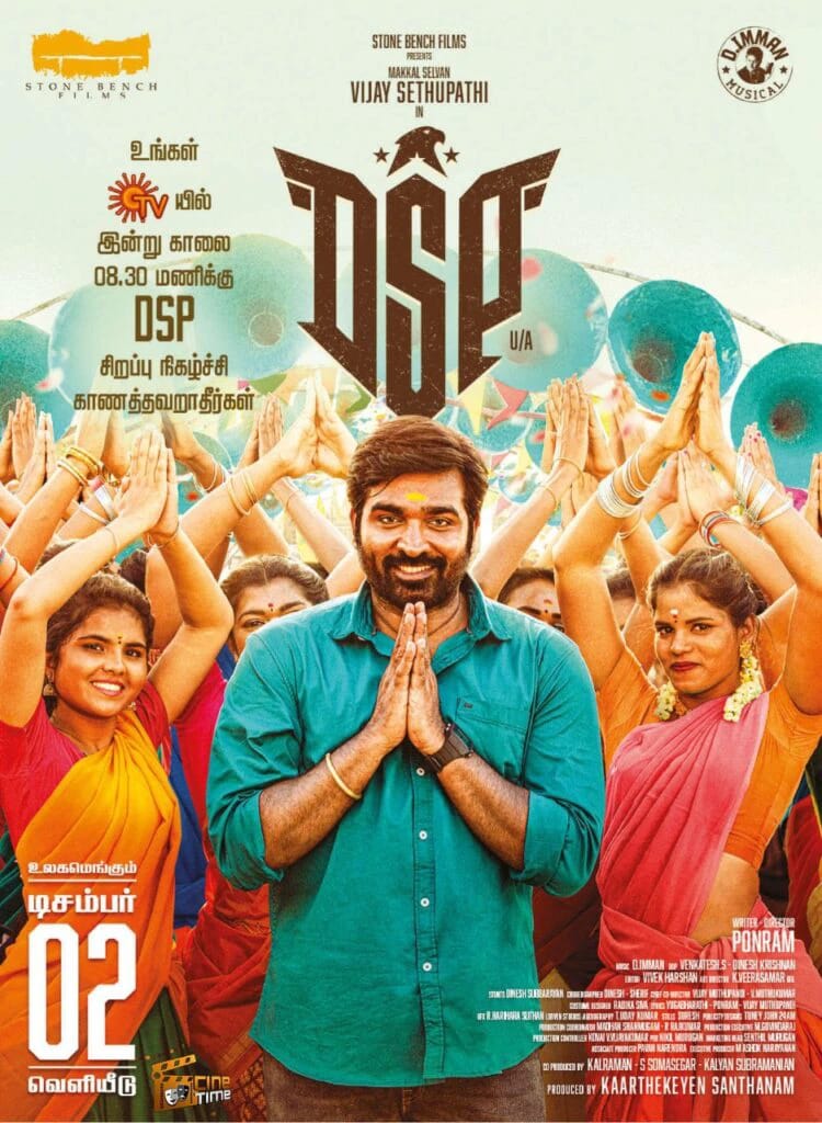 അതേസമയം, ടീമില് നിന്നുള്ള മറ്റൊരു അപ്ഡേറ്റ്, ഒരു മാസ് എന്റര്ടെയ്നറായി ബില്ല് ചെയ്തിരിക്കുന്ന ഡിഎസ്പിക്ക് യു/എ സര്ട്ടിഫിക്കറ്റ് ലഭിച്ചു എന്നതാണ്. എം വാസ്കോഡഗാമ എന്ന പോലീസുകാരനായി വിജയ് സേതുപതിയെ അവതരിപ്പിക്കുന്ന ചിത്രത്തില് മുന് മിസ് ഇന്ത്യ വേള്ഡ് അനുക്രീതി വാസ്, ശിവാനി നാരായണന്, കോമാലി ഫെയിം പുഗഴിനൊപ്പം കുക്കു, ഇളവരസു, ജ്ഞാനസമ്മന്ദന്, ദീപ, സിംഗംപുലി എന്നിവരും അഭിനയിക്കുന്നു.വെങ്കിടേഷ് എസ്, ദിനേശ് കൃഷ്ണന് ബി എന്നിവരുടെ ഛായാഗ്രഹണത്തില്, ഡിഎസ്പി വിവേക് ഹര്ഷന് എഡിറ്റിംഗും കാര്ത്തേകേയന് സന്താനം നിര്മ്മിക്കുന്നു.